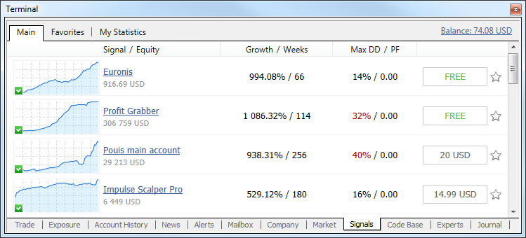 - The list of signals now contains growth charts similar to those displayed on the MQL5.community site. A green icon in the lower left corner of the chart indicates that the signal is based on a real account.