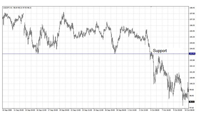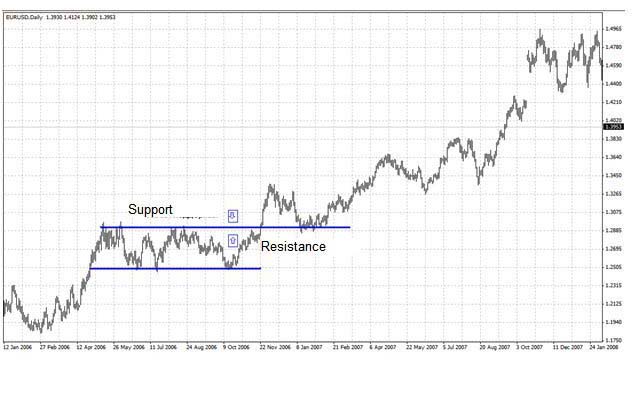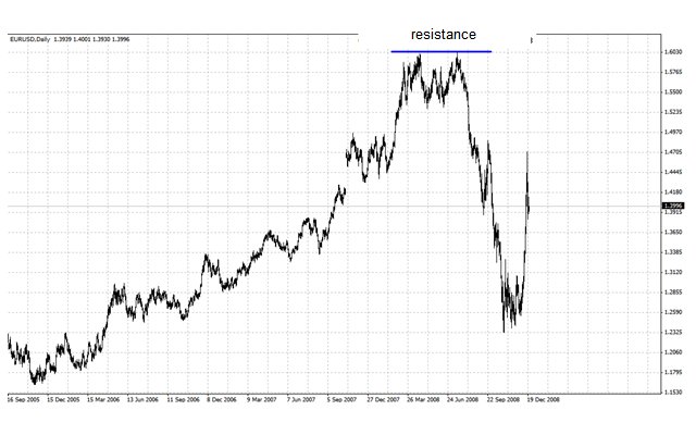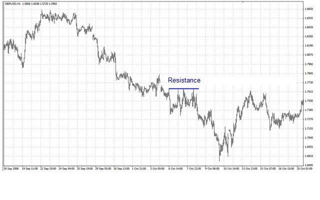 بالإضافة إلى خطوط الاتجاه، يمكن أن يكون الانخفاض والارتفاع بمثابة مستويات دعم ومقاومة (الشكل 6 والشكل 7). ومع ذلك، فإن الارتفاع أو الانخفاض السابق لا يعني أنه المستوى الذي سيقفز منه السعر مرة أخرى. يخبروننا أنه عندما يتحرك السعر بالقرب منهم، فإنه قد يلتقي بمستوى الدعم أو المقاومة بالقرب من القاع أو الارتفاع لأن السوق يتذكر أنه كان هناك تكافؤ بين الثيران والدببة عند هذا المستوى، وعندما يقترب السعر من المستوى مستوى الدعم يبدأ الجميع بالشراء، وعندما يقترب من مستوى المقاومة، على العكس، يبدأون بالبيع. يمكن اعتبار اختراق الحد الأدنى أو الحد الأقصى السابق بمثابة إشارة لمزيد من الانخفاض أو الارتفاع في الأسعار.