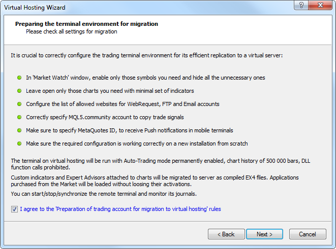 If you are sure that your terminal is ready for copying and you have read the rules, tick the "I agree to the 'Preparation of trading account for migration to virtual hosting' rules" option and click Next.