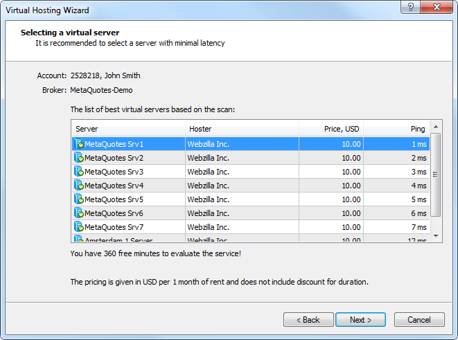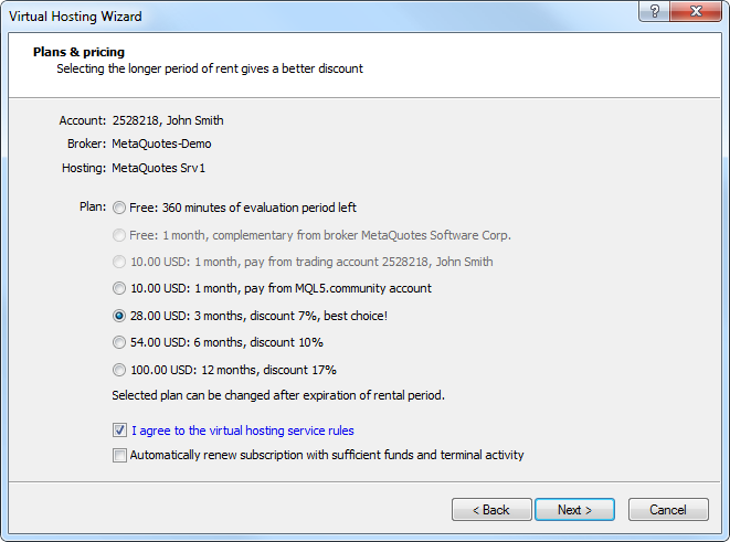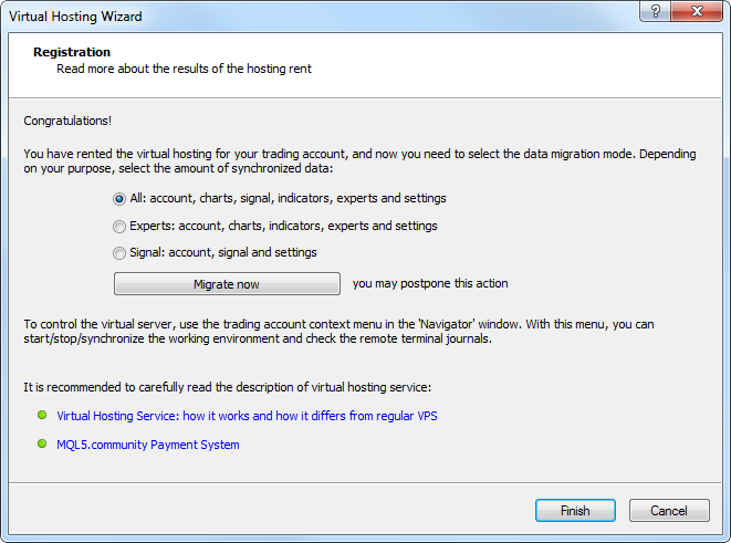 Virtual Hosting Cloud is a server network distributed all around the world and supporting special versions of MetaTrader client terminal. Selection of a suitable location, service plan, payment and synchronization is fully automated. A trader needs to complete only 5 steps in order to rent the virtual copy of a terminal with minimal network latency to the broker's trade server and select the most suitable service plan directly from MetaTrader4.