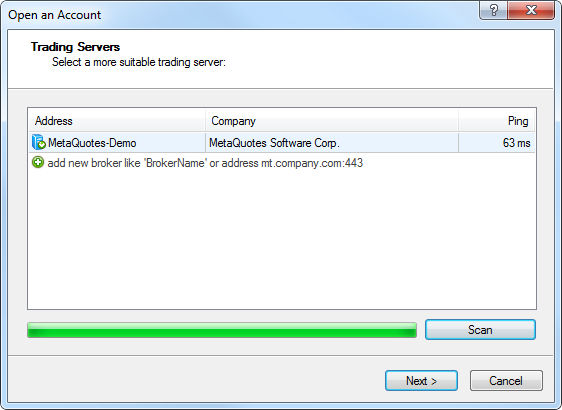 The first stage of opening a new account is selection of a trading server for connection. This window allows traders to select a proposed server or add a new one.