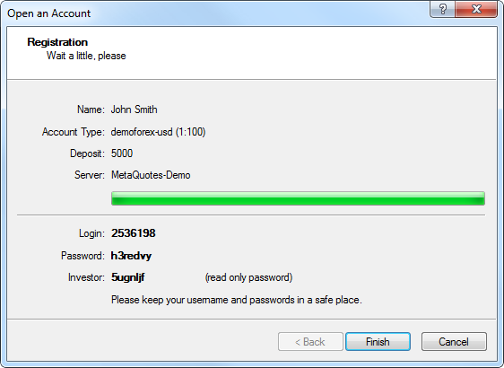 After clicking Finish, the newly created account is automatically connected to the trade server. It also appears in the Accounts section of the Navigator window. If Cancel is clicked in this window, connection to the trade server is not performed and the account is not added to the Navigator window, though it is already created. You can connect to the server later using the account details.