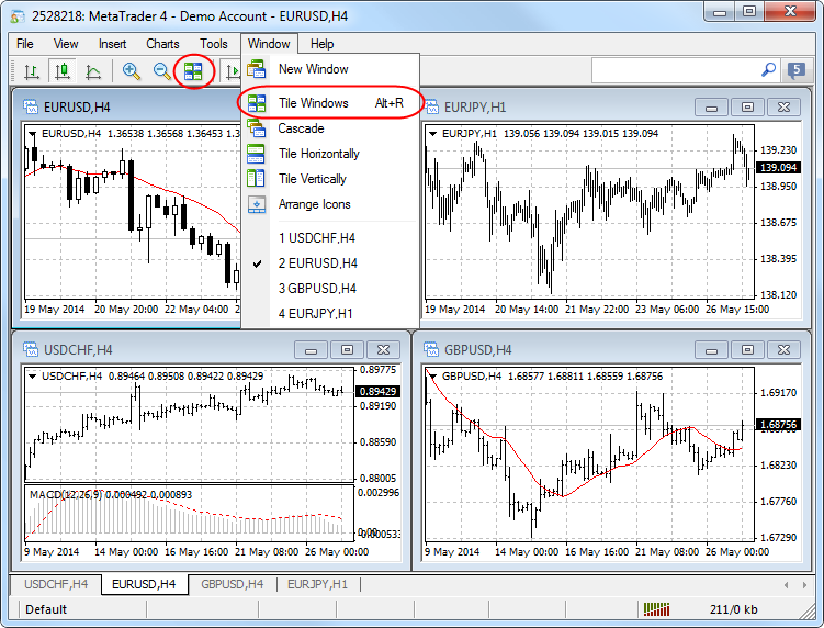Tile Windows is the most widely used method allowing users to efficiently arrange several open charts for working with them. In this mode, the windows are displayed next to each other allowing you to monitor price changes on multiple charts. The following changes have been implemented to this function: