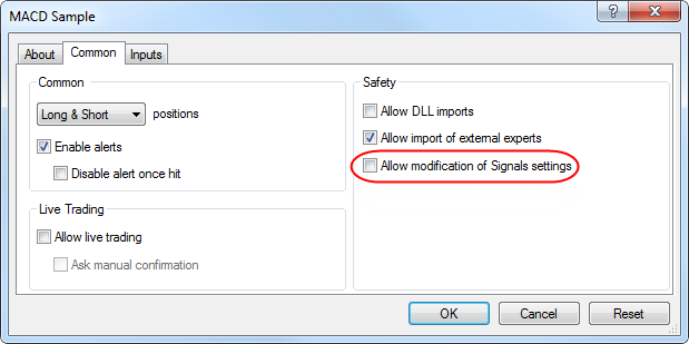 By default, a trading robot is not allowed to change signal settings for security reasons. To enable this function, tick the "Allow modification of Signals settings" option in Expert Advisor settings.