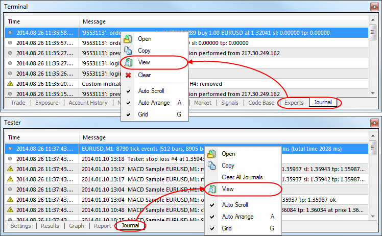 To view logs, open the context menu of the Journal tab and run the Browse command.
