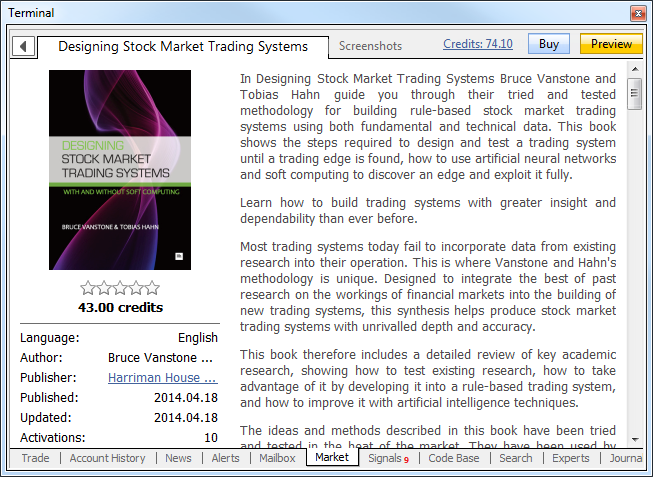 Just like MetaTrader 4 applications, books can be purchased at MQL5.community Market as well as directly via MetaTrader 4 terminal. All books are accompanied by descriptions and screenshots: