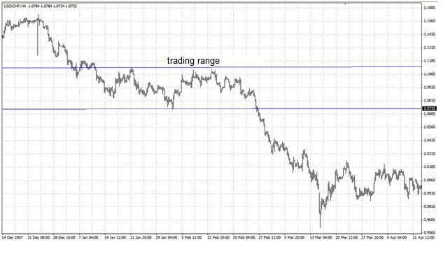 ช่วงของการเทรดจะไม่เหมือนกับเส้นแนวโน้ม ซึ่งช่วงของการเทรดนั้นจะเป็นเส้นแนวนอนลากผ่านจุดต่ำสุดและจุดสูงสุดที่อยู่ในระดับเดียวกันหลายจุดต่อเนื่องกันในช่วงเวลานั้นๆ (รูปที่ 15)