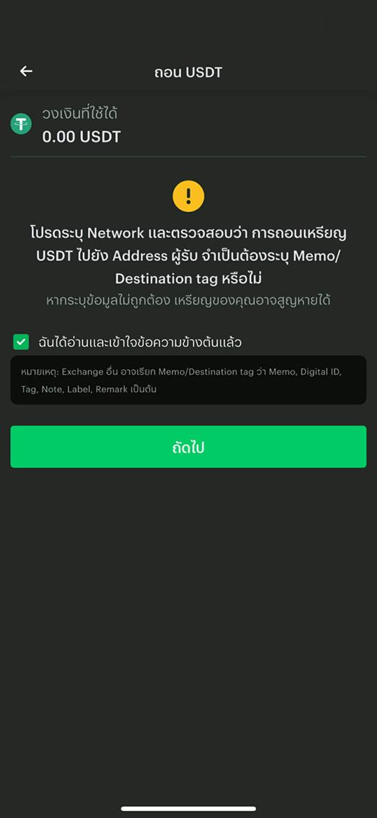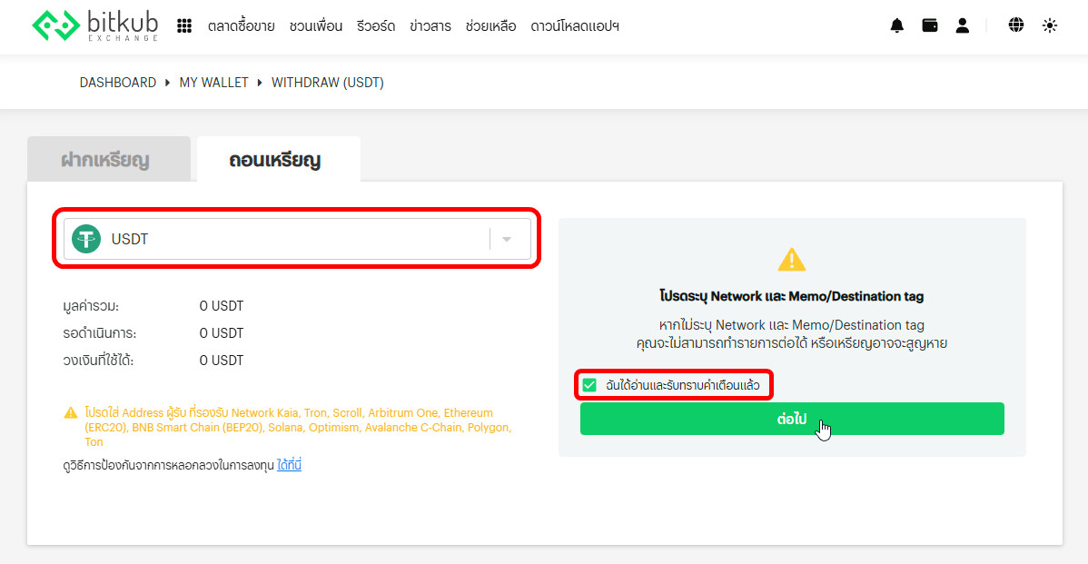B4. ที่หน้า "ถอน USDT/USDC" ระบบแสดงข้อความเตือน > กดติ๊กยอมรับและกดปุ่ม "ถัดไป"