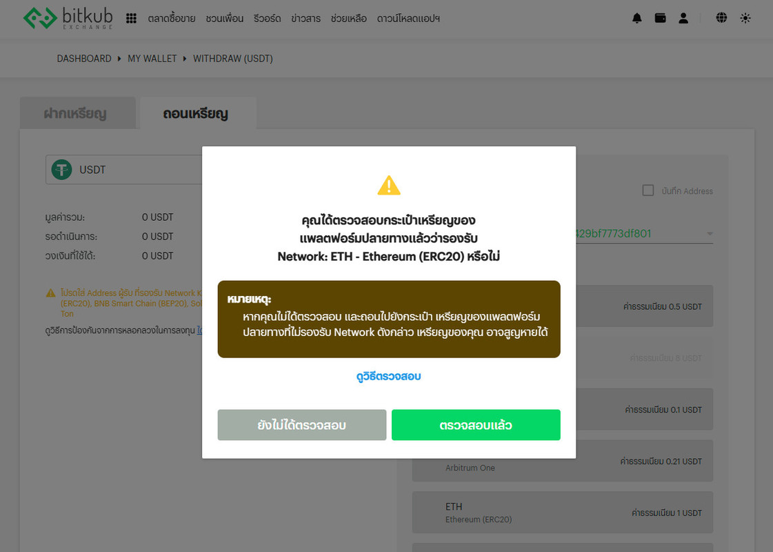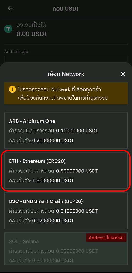 B6. เลือก "ETH Ethereum (ERC20)" ระบบจะขึ้นข้อความเตือนให้ตรวจสอบ Network ที่ท่านเลือก เมื่อแน่ใจว่าถูกต้องให้กดปุ่ม "ตรวจสอบแล้ว"