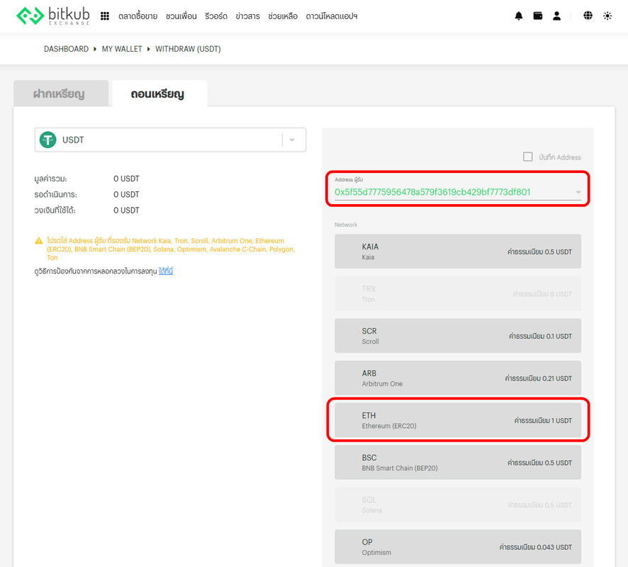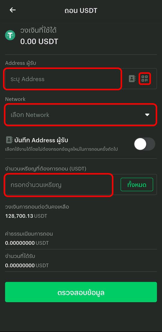 D6. เลือกเหรียญที่ต้องการถอน (USDT หรือ USDC) ระบบจะแสดงช่อง Address ผู้รับให้กรอก