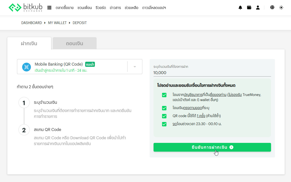C3. ช่องทางฝากเป็น Mobile Banking (QR Code) > ระบุจำนวนเงินที่ต้องการฝากเป็นเงินบาทไทย > ติ๊กเลือกอ่านและยอมรับเงื่อนไขทั้งหมดแล้วกดปุ่ม "ยืนยันการฝากเงิน"