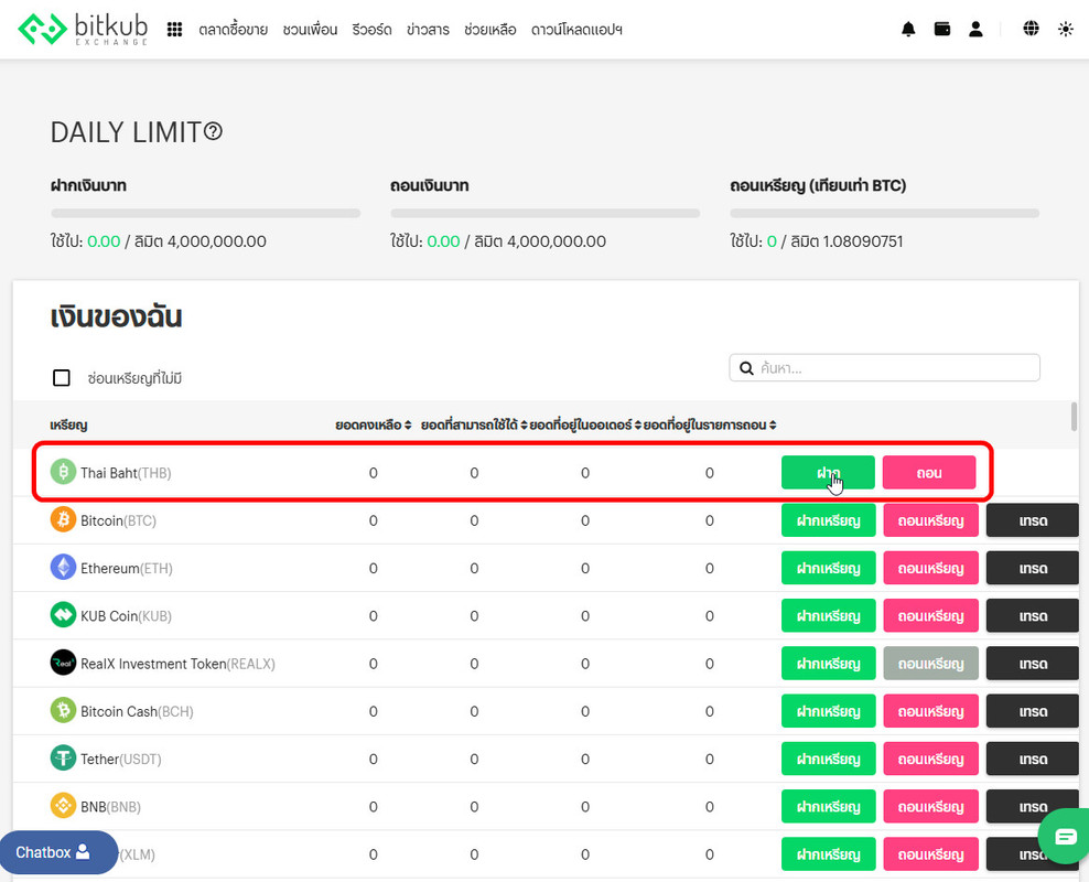 C2. เลือก "ฝาก" ที่ "Thai Baht(THB)" ระบบจะพาไปยังหน้าฝากเงิน