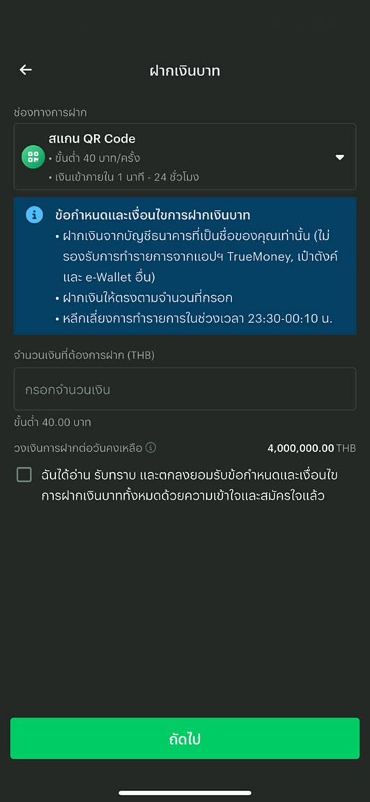 A2. ช่องทางฝากเป็น "สแกน QR Code" > ระบุจำนวนเงินที่ต้องการฝากเป็นเงินบาทไทย > ติ๊กเลือกอ่านและยอมรับเงื่อนไขทั้งหมดแล้วกดปุ่ม "ถัดไป"