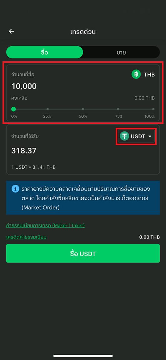 ที่ช่อง "จำนวนที่ได้รับ" เลือกเหรียญที่ต้องการซื้อ ได้แก่ USDT หรือ USDC ระบบจะคำนวณค่าเงินคริปโตจากเงินบาทที่เราต้องการซื้อ จากนั้นทำตามขั้นตอนจนเสร็จสิ้น