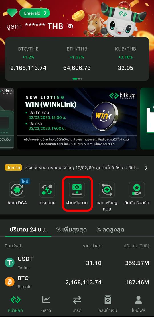 A1. เข้าแอป Bitkub > ฝากเงินบาท