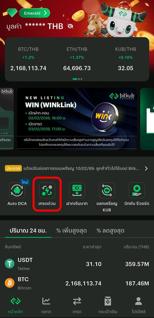 A5. หลังจากโอนเงินเข้า Bitkub แล้ว ก็สามารถซื้อเหรียญคริปโต USDT/USDC ได้ โดยเลือกเมนู "เทรดด่วน"