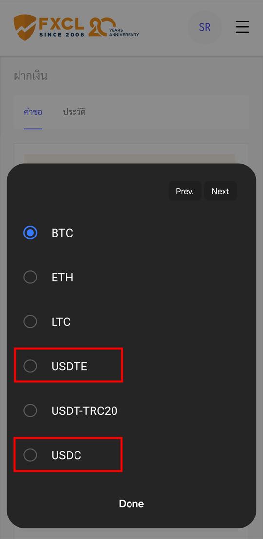 - ตัวเลือกเหรียญ เลือกเป็น "๊USDTE" (คือ USDT-ERC20) หรือ "USDC" (คือ USDC-ERC20)
