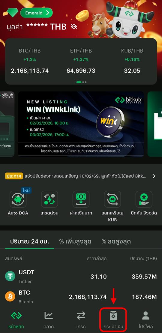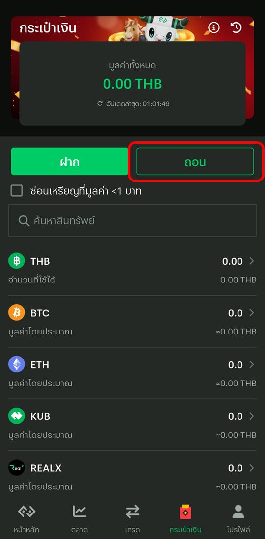 ตรวจสอบจำนวนเหรียญหรือยอดเงินคงเหลือ (THB) ได้ที่เมนู กระเป๋าเงิน (Wallet) รูปกระเป๋าสตางค์