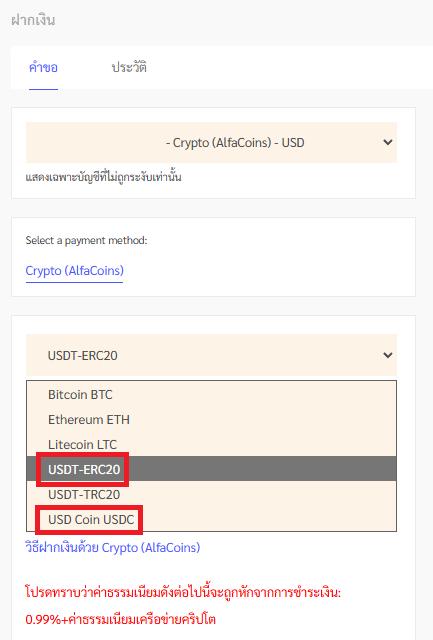 - ตัวเลือกเหรียญ เลือกเป็น "USDT-ERC20" หรือ "USD Coin USDC"