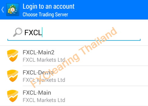 5. หน้าค้นหา broker ให้เลือก “FXCL-Main 2” สำหรับบัญชีเทรดจริง หรือ “FXCL-Demo” สำหรับบัญชีทดลอง หากไม่มีตัวเลือก ให้พิมพ์ในช่องค้นหา (Find broker)