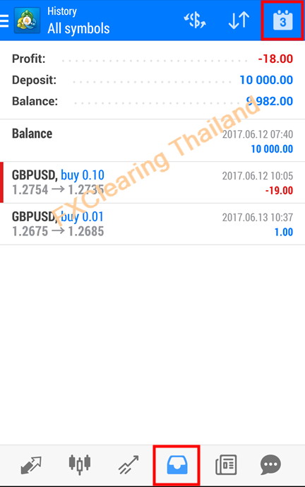 History แสดงประวัติการเทรดโดยสามารถเลือกช่วงเวลาดูประวัติได้โดยกดที่รูปปฏิทินที่มุมบนขวาของหน้าจอ