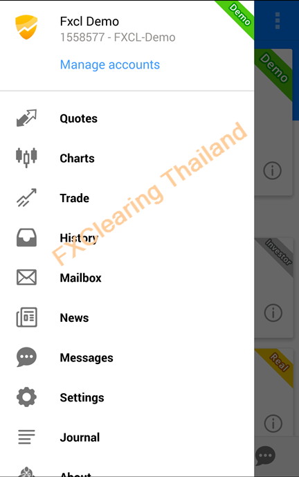 เมื่อเข้ามายังเมนูด้านข้าง จะพบว่าสามารถกดเข้าไปหน้า Quotes, Charts, Trade, History และ News ได้เช่นกัน นอกจากนี้ยังมีเมนูที่สำคัญอื่นๆ ดังนี้