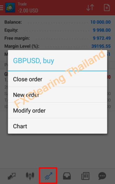 ที่เมนู Trade ให้กดที่ออเดอร์ที่ต้องการปิดหรือแก้ไขค้างไว้ หน้าจอจะแสดงเมนูขึ้นมา หากต้องการปิดออเดอร์ให้กดที่ Close order หากต้องการแก้ไขออเดอร์ให้กดที่ Modify order